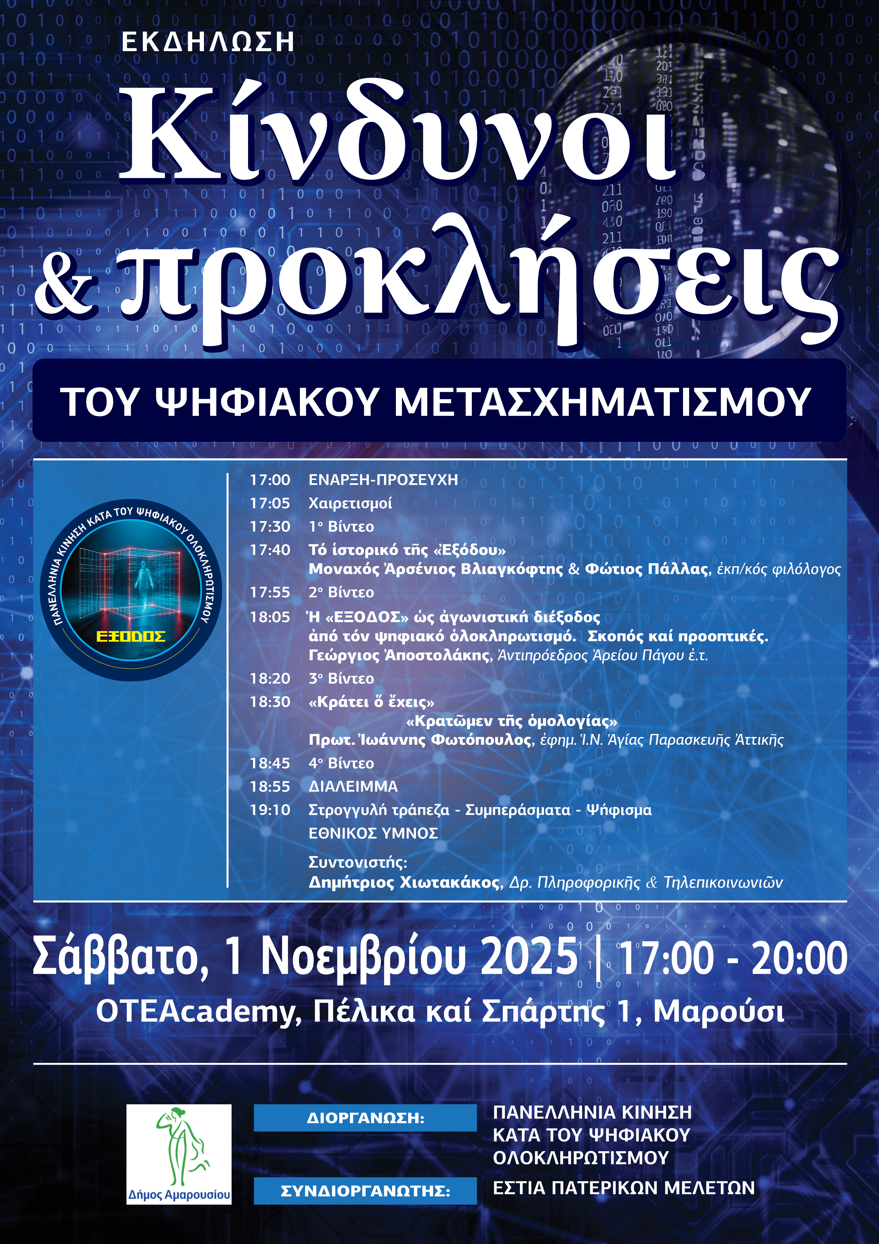 | Συνέδρια - Σεμινάρια - Διαλέξεις - Ομιλίες | ΗΜΕΡΙΔΑ - ΕΚΔΗΛΩΣΗ: ΚΙΝΔΥΝΟΙ ΚΑΙ ΠΡΟΚΛΗΣΕΙΣ ΤΟΥ ΨΗΦΙΑΚΟΥ ΜΕΤΑΣΧΗΜΑΤΙΣΜΟΥ ΣΑΒΒΑΤΟ 1 ΝΟΕΜΒΡΙΟΥ 2025 OTE ACADEMY 17.00-20.00 |  Κινδυνοι & Προκλησεις_Αφισα_24-10-25.jpg | 29/10/2025 - 14:33 | Άλλο | |